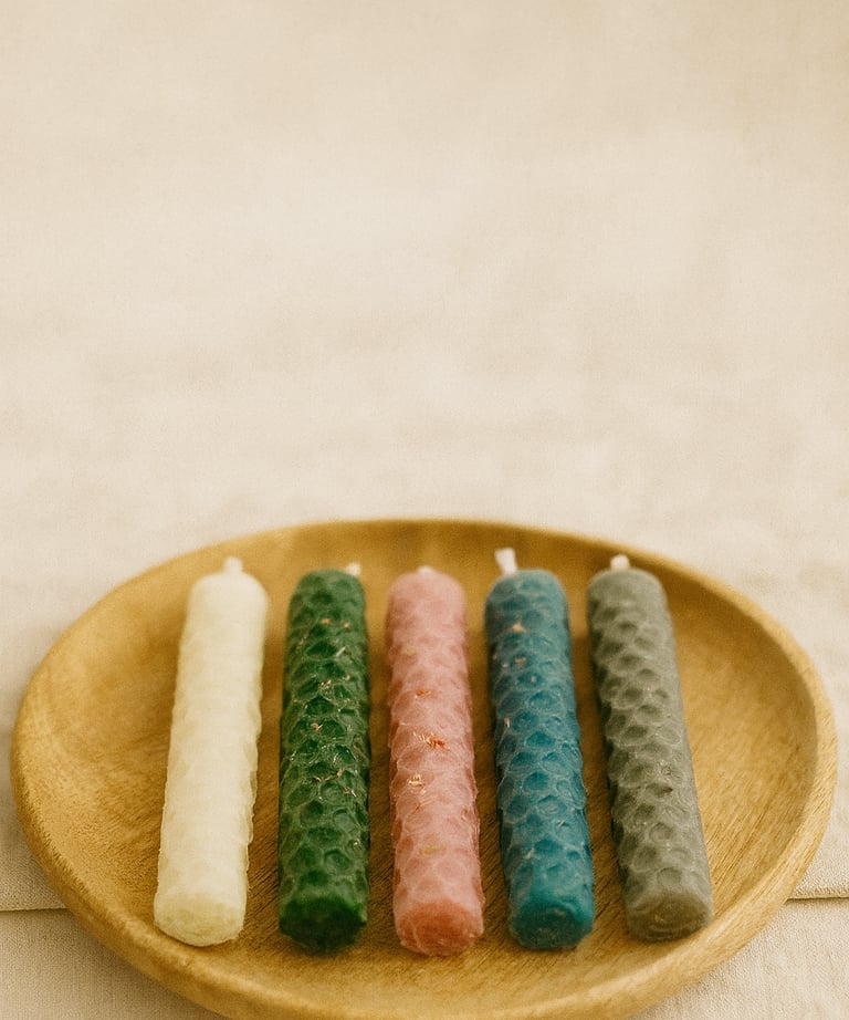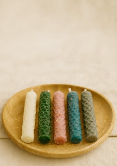 Des bougies naturelles, roulées à la main avec cire d'abeille et fleures séchées, pour accompagner vos intentions.